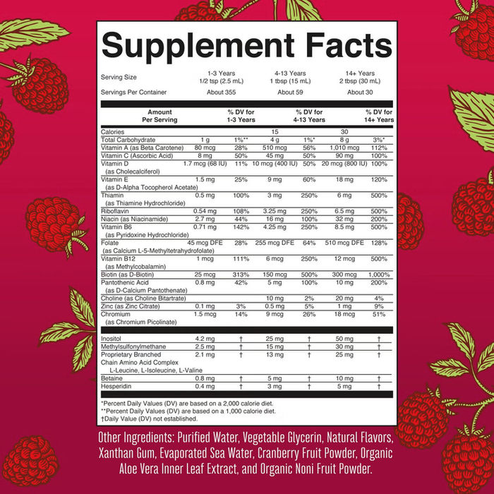MaryRuth’s delicious Raspberry Liquid Morning Multivitamin is an easy-to-take liquid with minerals, amino acids, and multiple essential vitamins including antioxidant vitamin C, vitamin D, vitamin E, and beta carotene.